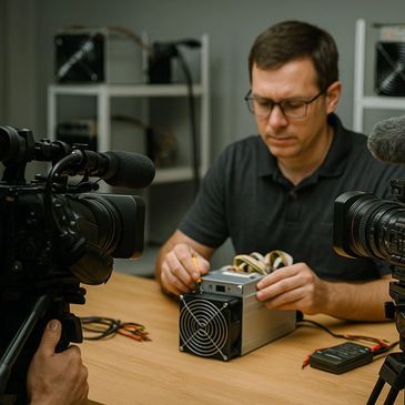 Professional filming sessions of an ASIC repair training course, highlighting the high production quality and hands-on instruction that will soon be available. This “COMING SOON” program is designed to offer basic, advanced, and expert-level training, covering all major brands and models of ASIC mining equipment. With certified instructor